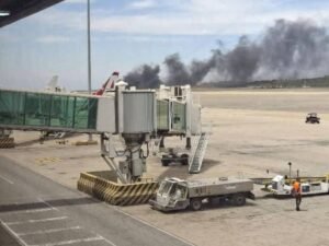 Videos grabados por pasajeros y personal del aeropuerto mostraron una columna de humo saliendo de la pista de Maiquetía minutos después del impacto.